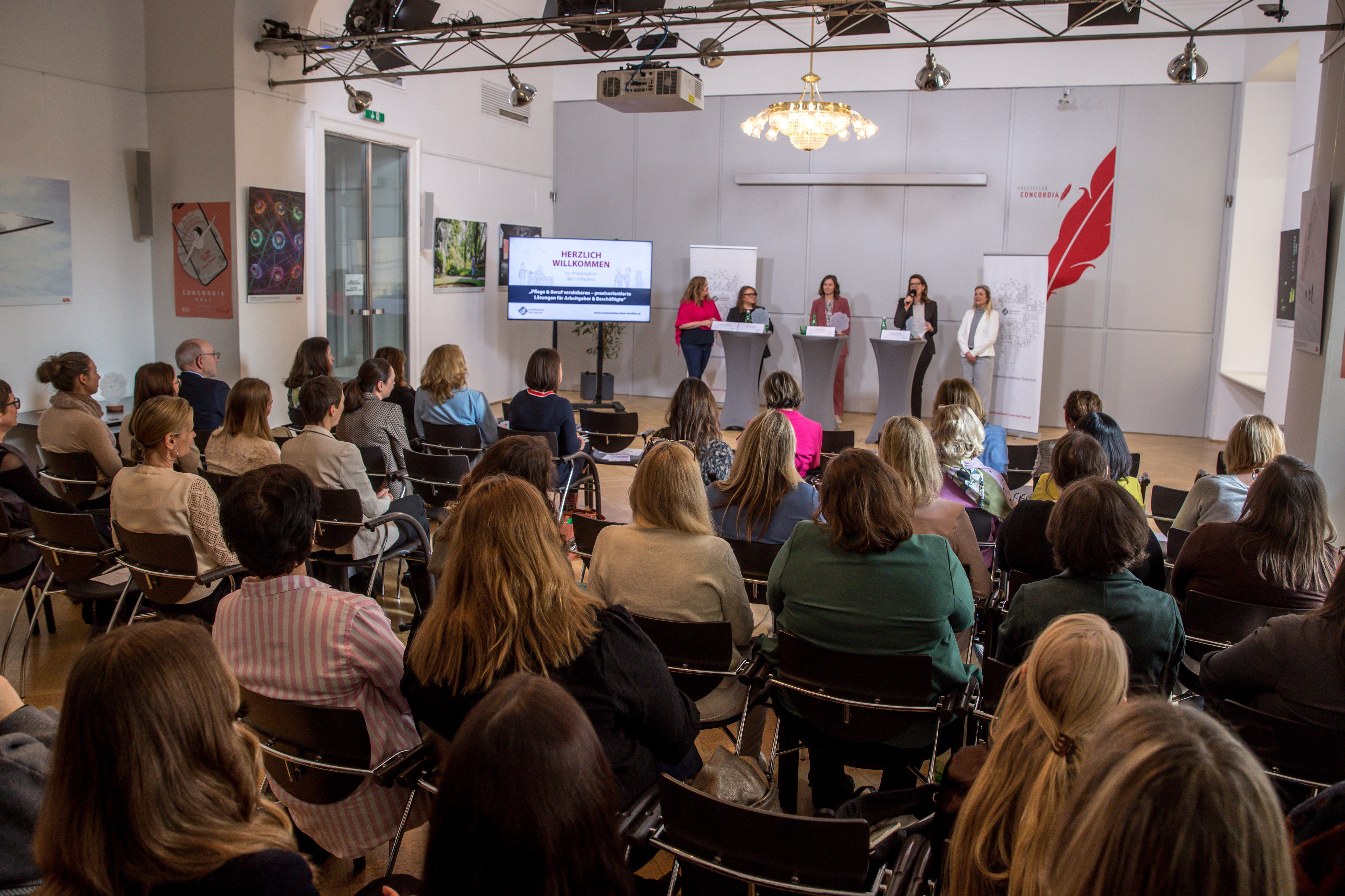 Anlässlich der Veröffentlichung der Neuauflage unseres Praxisleitfadens "Pflege und Beruf vereinbaren" luden wir gemeinsam mit dem Hilfswerk am 4. März 2026 zu einer Podiumsdiskussion im Presseclub Concordia in Wien. Claudia Bauer, Bundesministerin für Europa, Integration und Familie im Bundeskanzleramt, und Unternehmensvertreterinnen diskutierten dabei über die aktuelle und gesellschaftliche Relevanz des Themas und zeigten praxiserprobte Maßnahmen für eine bessere Vereinbarkeit von Pflege und Beruf auf.